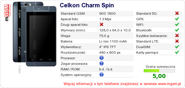 Dane telefonu Celkon Charm Spin na Twojej stronie