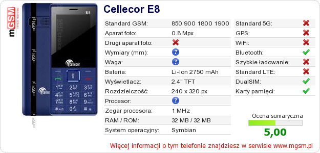 Dane telefonu Cellecor E8 na Twojej stronie