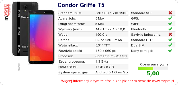 Dane telefonu Condor Griffe T5 na Twojej stronie