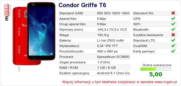 Dane telefonu Condor Griffe T6 na Twojej stronie