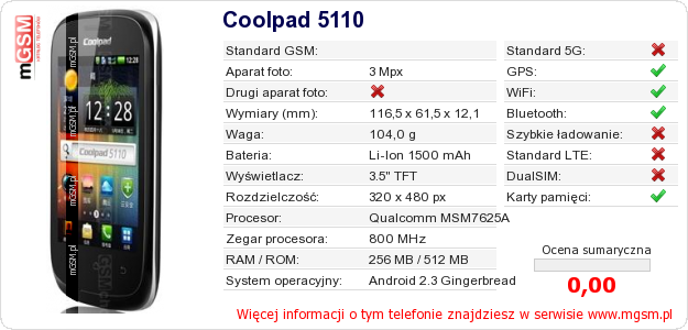 Dane telefonu Coolpad 5110 na Twojej stronie