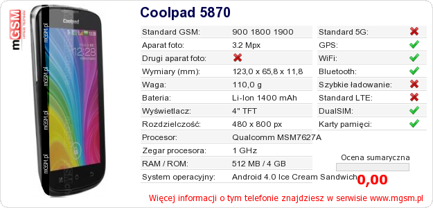 Dane telefonu Coolpad 5870 na Twojej stronie