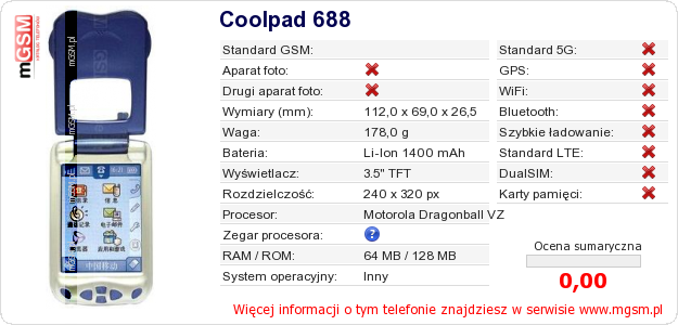 Dane telefonu Coolpad 688 na Twojej stronie