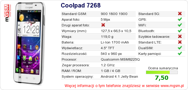 Dane telefonu Coolpad 7268 na Twojej stronie