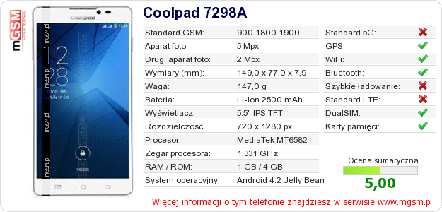 Dane telefonu Coolpad 7298A na Twojej stronie