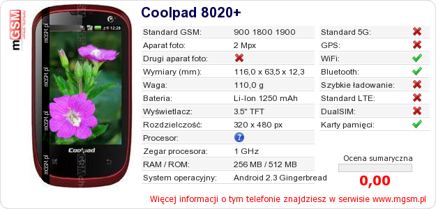 Dane telefonu Coolpad 8020+ na Twojej stronie