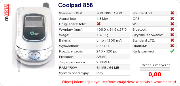 Dane telefonu Coolpad 858 na Twojej stronie