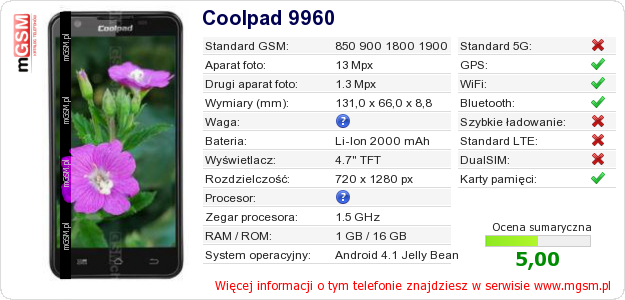 Dane telefonu Coolpad 9960 na Twojej stronie