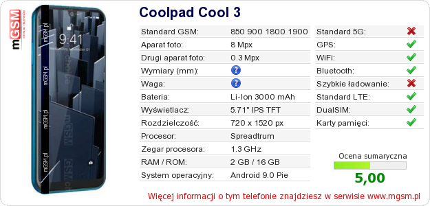 Dane telefonu Coolpad Cool 3 na Twojej stronie