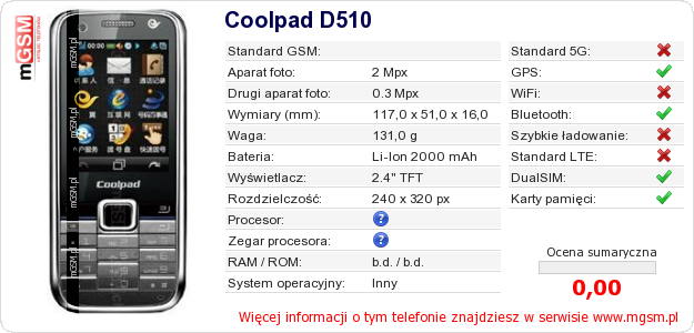 Dane telefonu Coolpad D510 na Twojej stronie