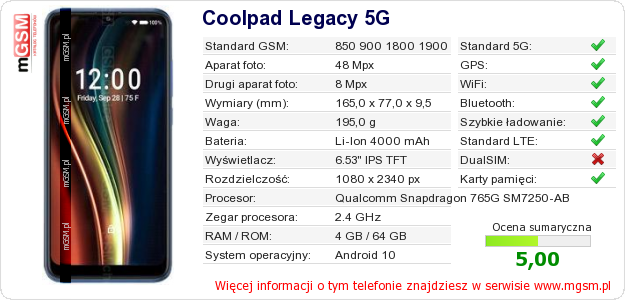 Dane telefonu Coolpad Legacy 5G na Twojej stronie