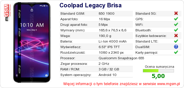 Dane telefonu Coolpad Legacy Brisa na Twojej stronie