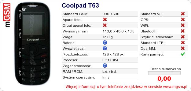 Dane telefonu Coolpad T63 na Twojej stronie