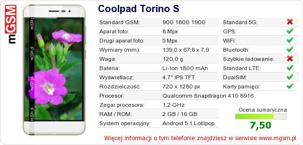 Dane telefonu Coolpad Torino S na Twojej stronie