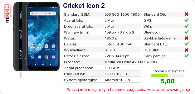 Dane telefonu Cricket Icon 2 na Twojej stronie