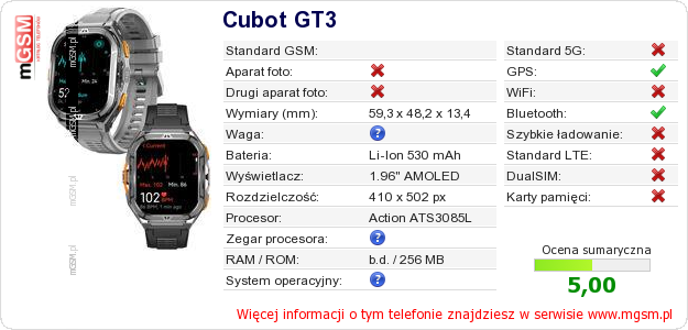 Dane telefonu Cubot GT3 na Twojej stronie