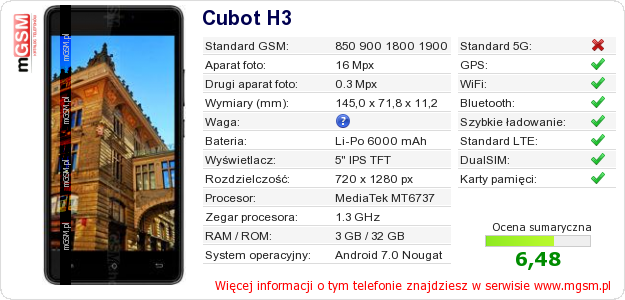 Dane telefonu Cubot H3 na Twojej stronie