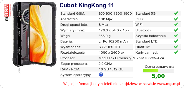 Dane telefonu Cubot KingKong 11 na Twojej stronie