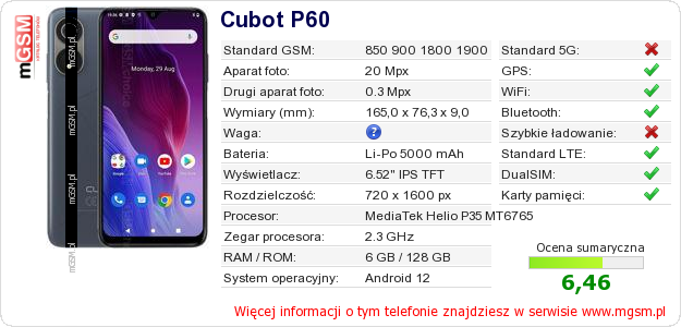 Dane telefonu Cubot P60 na Twojej stronie