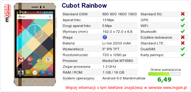 Dane telefonu Cubot Rainbow na Twojej stronie