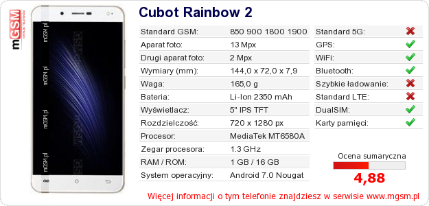 Dane telefonu Cubot Rainbow 2 na Twojej stronie