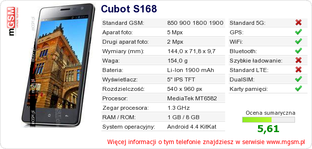 Dane telefonu Cubot S168 na Twojej stronie