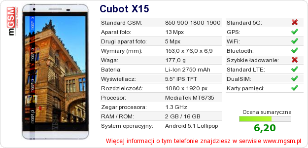 Dane telefonu Cubot X15 na Twojej stronie