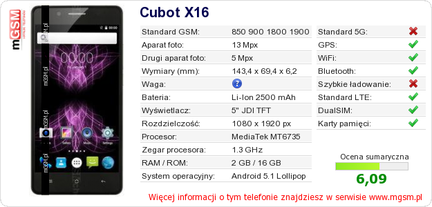 Dane telefonu Cubot X16 na Twojej stronie