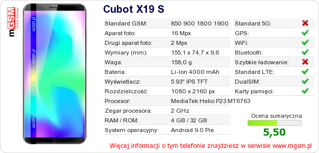 Dane telefonu Cubot X19 S na Twojej stronie