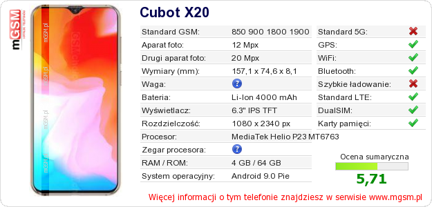 Dane telefonu Cubot X20 na Twojej stronie