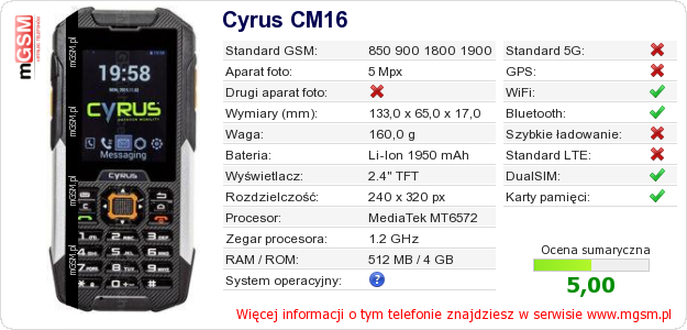 Dane telefonu Cyrus CM16 na Twojej stronie