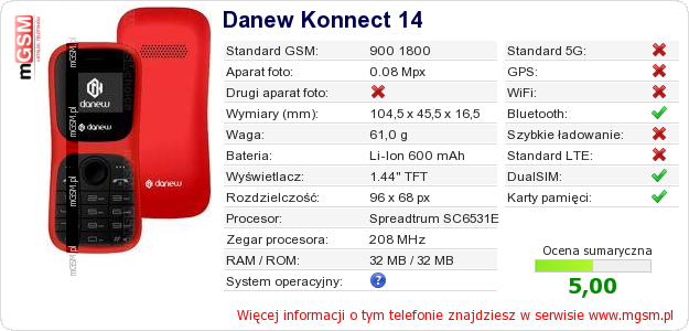 Dane telefonu Danew Konnect 14 na Twojej stronie