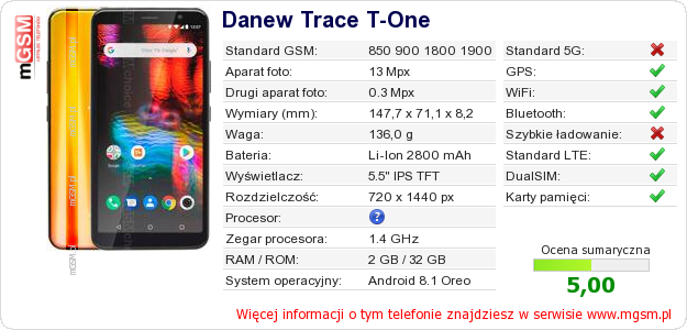 Dane telefonu Danew Trace T-One na Twojej stronie