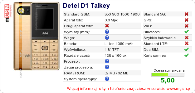 Dane telefonu Detel D1 Talkey na Twojej stronie