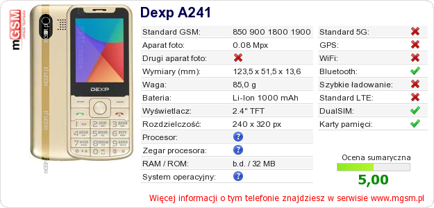 Dane telefonu Dexp A241 na Twojej stronie