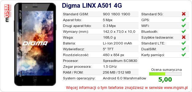 Dane telefonu Digma LINX A501 4G na Twojej stronie