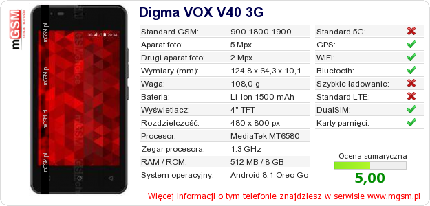 Dane telefonu Digma VOX V40 3G na Twojej stronie