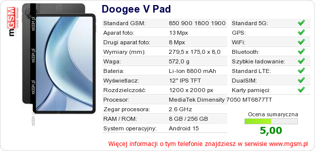 Dane telefonu Doogee V Pad na Twojej stronie