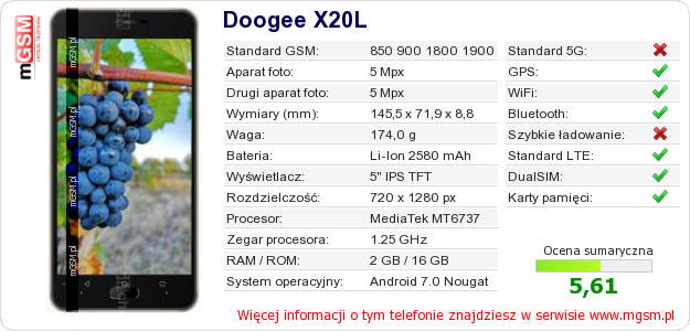 Dane telefonu Doogee X20L na Twojej stronie
