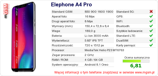 Dane telefonu Elephone A4 Pro na Twojej stronie