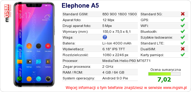 Dane telefonu Elephone A5 na Twojej stronie