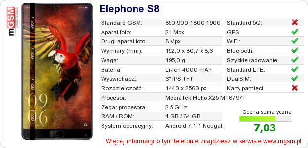 Dane telefonu Elephone S8 na Twojej stronie