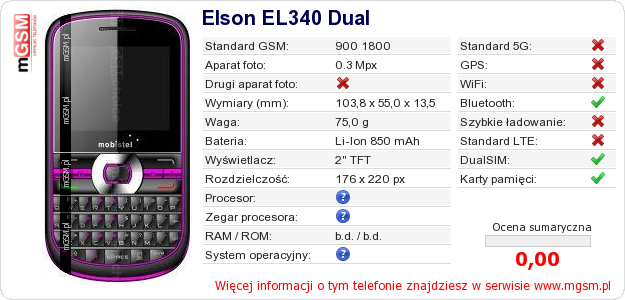 Dane telefonu Elson EL340 Dual na Twojej stronie