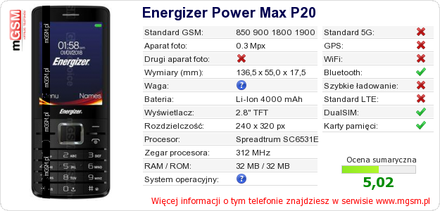 Dane telefonu Energizer Power Max P20 na Twojej stronie