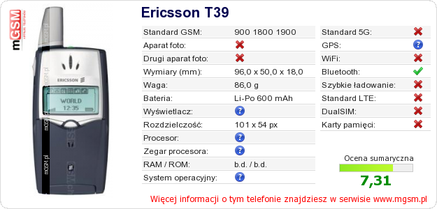 Dane telefonu Ericsson T39 na Twojej stronie