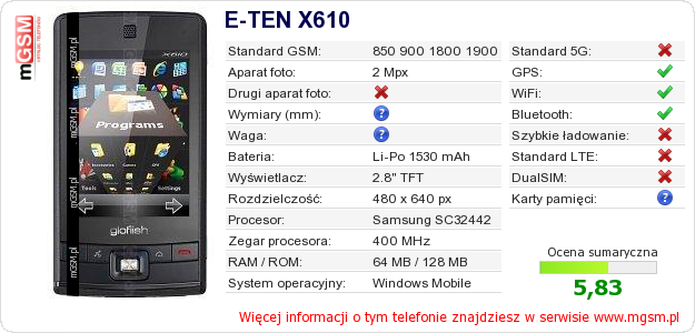 Masz swoją stronę? Chcesz wstawić gdzieś informacje o podstawowych danych telefonu E-TEN X610 ? To bardzo proste. Możesz pobrać obrazek, lub skopiować i wkleić na stronę poniższy kod:Wklejenie tego kodu spowoduje wyświetlenie poniższego obrazka: