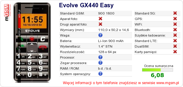 Masz swoją stronę? Chcesz wstawić gdzieś informacje o podstawowych danych telefonu Evolve GX440 Easy ? To bardzo proste. Możesz pobrać obrazek, lub skopiować i wkleić na stronę poniższy kod:Wklejenie tego kodu spowoduje wyświetlenie poniższego obrazka: