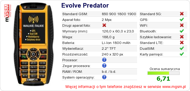 Dane telefonu Evolve Predator na Twojej stronie