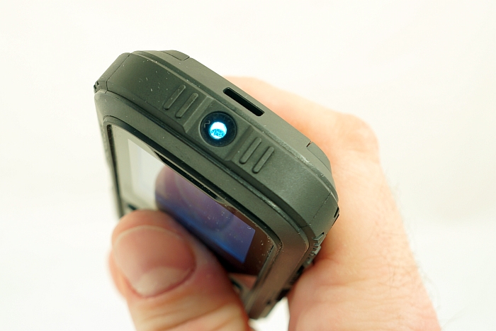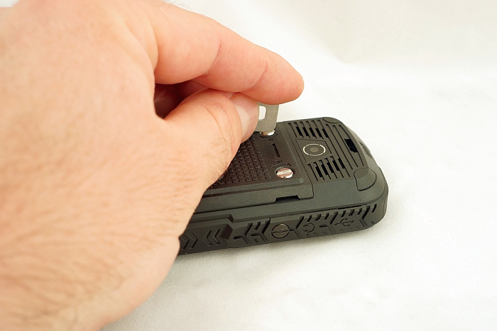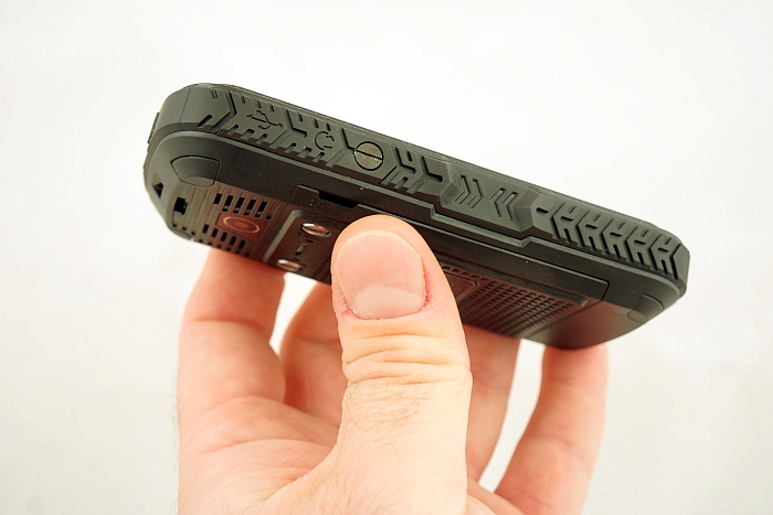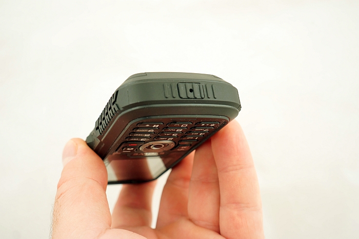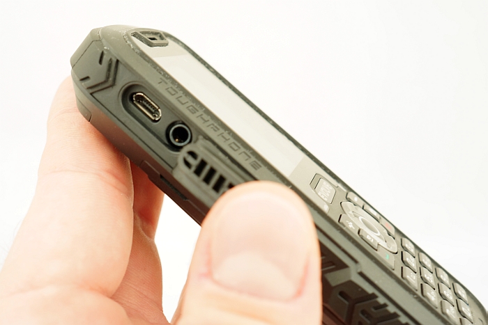 Zadbano o uszczelnienie gniazda słuchawkowego i microUSB, umieszczonych tym razem pod wspólną, gumową pokrywą, mocowaną do korpusu atrakcyjnym wizualnie, dużym wkrętem. Wkręty mocują także pokrywę baterii, również wzbogaconą o podwójną, silikonową uszczelkę. Pozostałe cztery śruby, spajające korpus w całość, zamaskowano czterema plastikowymi zaślepkami. Kontynuując oględziny tyłu, zauważymy jeszcze szczeliny głośnika, ucho do mocowania smyczy oraz obiektyw aparatu, pozbawionego tym razem diody LED. Ta powędrowała na górną ściankę telefonu, gdzie pełni wyłącznie rolę latarki. Muszę tu odnotować, iż owa latarka ma na klawiaturze osobny, dedykowany przycisk, pozwalający uruchomić latarkę bez odblokowywania telefonu. Dedykowane klawisze otrzymały ponadto aparat fotograficzny i skrzynka SMS.