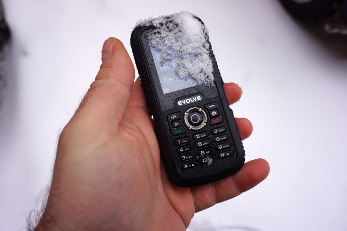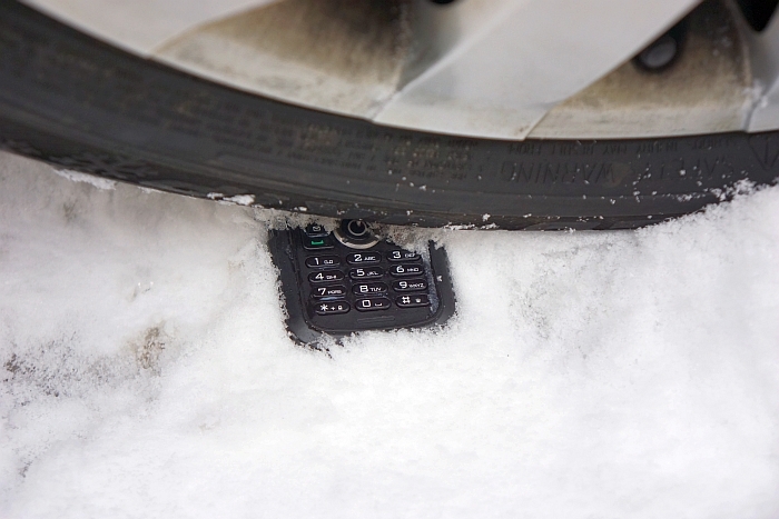 Skoro gładko przeszedłem w kierunku klawiatury - pora na jej ocenę. Przyciski numeryczne są rewelacyjne. Umieszczone są w sporych odstępach, jasno podświetlone i wykonane z wyglądającego na trwałe, twardego tworzywa. Bez problemu da się je obsługiwać bez zdejmowania rękawic. Nie da się niestety powiedzieć tego samego o klawiszach funkcyjnych. Nadano im niewielkie rozmiary i ciasno rozmieszczono wokół okrągłego dżojstika ułatwiającego poruszanie się po menu. Ich obsługa w rękawicy narciarskiej okazała się znacznie trudniejsza, niż wybranie numeru. Zachęcony solidną budową, poddałem telefon paru próbom wytrzymałości.